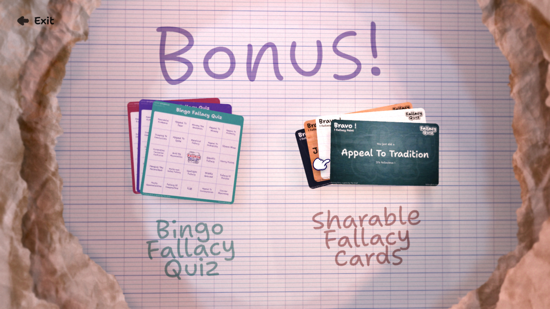 | Tags | Brain Training, Casual, fallacy, Hand-drawn, Indie, Local multiplayer, Quiz, Singleplayer, Text based, Trivia |