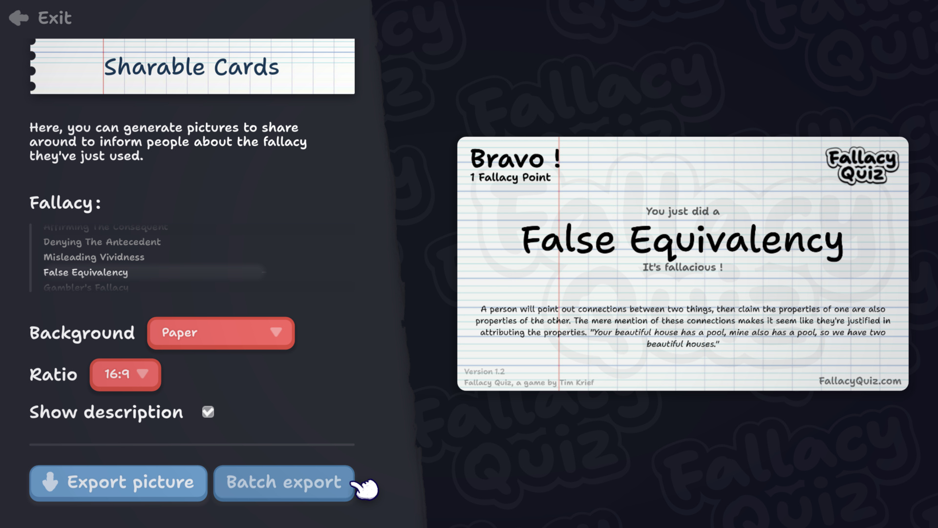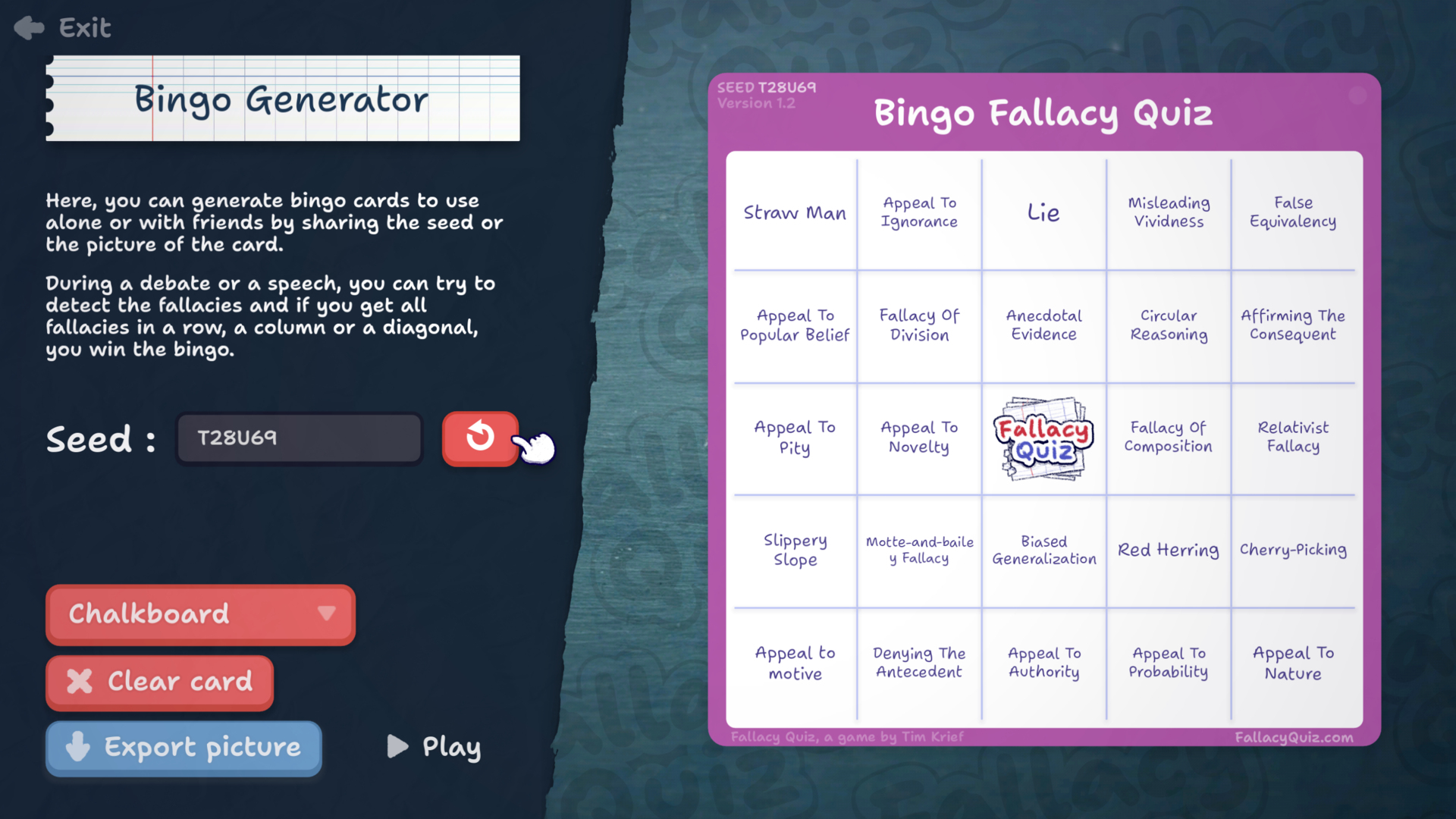 You can customize the background, and even hide the menu. As soon as you detect a fallacy, click on the card to cross it out and try to get a full line or diagonal of found fallacies. You can even export a picture of the card with the fallacies crossed to share an aftermath of the debate or speech.