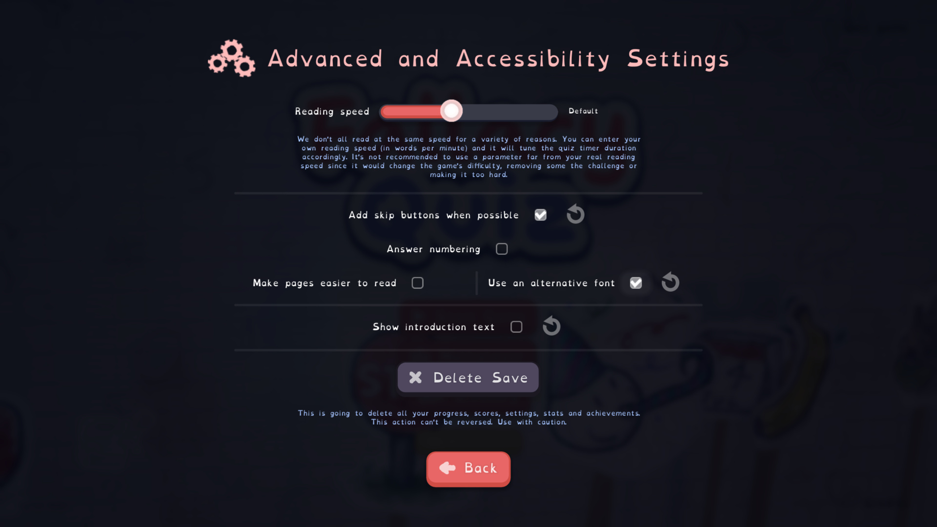 The font used in the game could be hard to read for some people, the OpenDyslexic font is now available as an alternative even if it could break some visual effects here and there. If you have a hard time with the original font, try this one by going into the advanced settings.